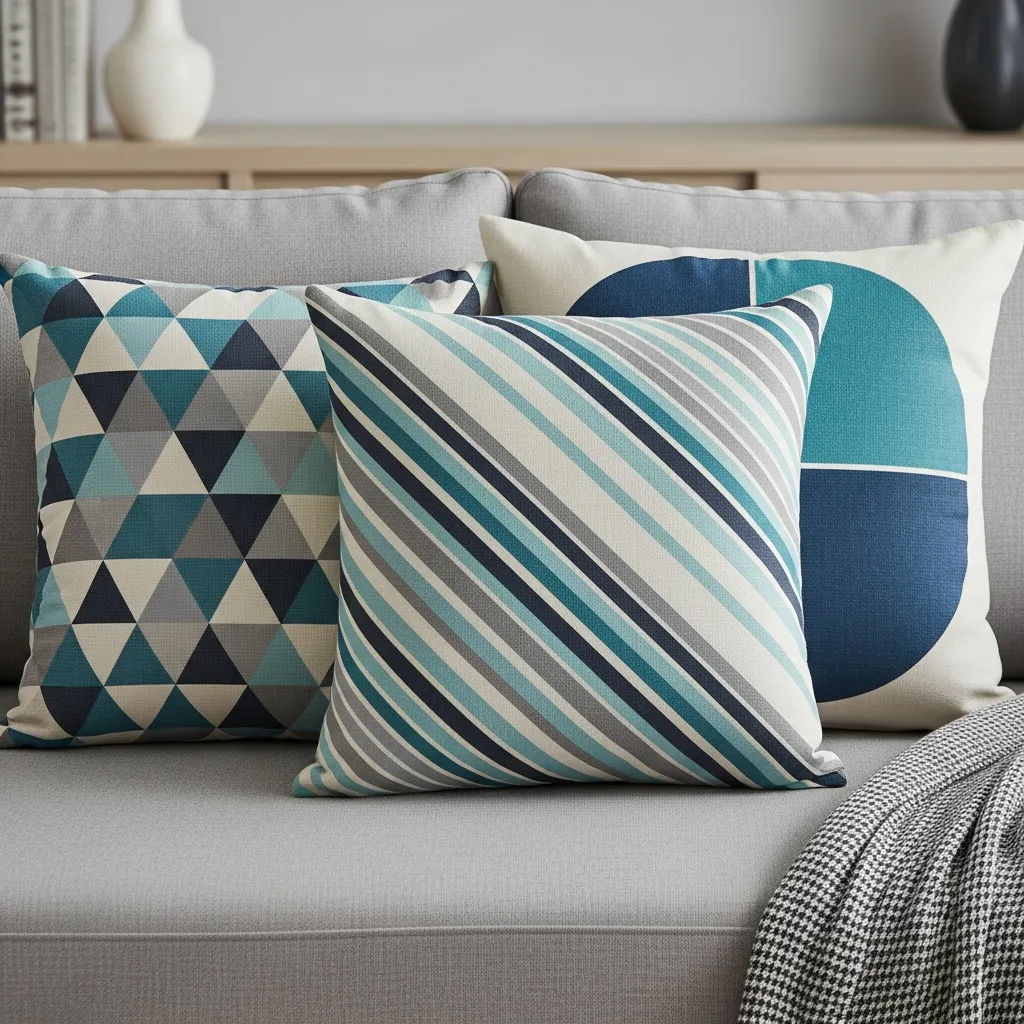 A set of three premium linen cushion covers featuring contemporary geometric patterns. Made from sustainable linen fibers with a crisp, natural texture suitable for New Zealand homes. These cushions bring modern elegance to your seating areas while maintaining comfort and durability. Appearance may vary based on individual styling choices.